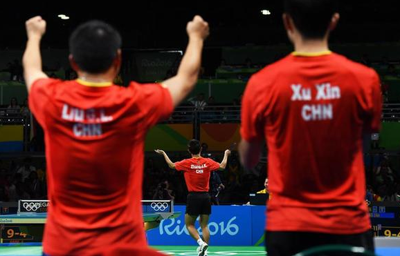8月15日,中国队教练刘国梁(左)和选手许昕庆祝张继科(中)获胜。 当日,在2016年里约奥运会乒乓球男子团体半决赛中,中国队以3比0战胜韩国队,挺进决赛。 新华社记者殷博古摄