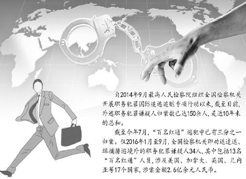 据了解,截至今年7月,“百名红通”逃犯中已有三分之一归案。仅2016年1月至9月,全国检察机关即劝返遣返、缉捕潜逃境外的职务犯罪嫌疑人34人,其中包括裴健强、陈祎娟、付耀波、周世勤等13名“百名红通”人员,涉及美国、加拿大、英国、几内亚等17个国家,涉案金额2.6亿余元人民币。
