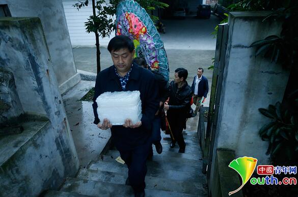 2016年10月26日,邱少华之子邱国明手捧父亲的骨灰盒,将父亲安葬在重庆市铜梁区人民公墓。中国青年网记者 张炎良 摄