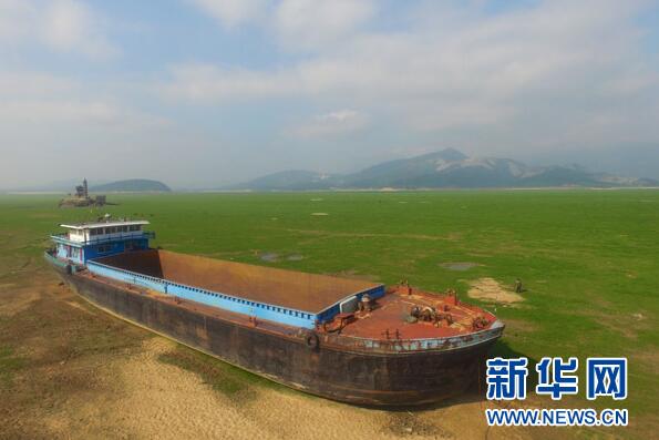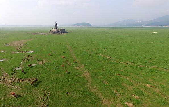 在江西省九江市都昌县露出水面的鄱阳湖草洲上,游客行走在昔日的湖底,蹲在紫红色的蓼子花丛中,恰如身处“大草原”中。很难想象,两个月前,这里还是水天一色的打鱼场。在与都昌县相邻的庐山市,古代遗留的落星墩也完全露出了水面。这个建有宝塔和小阁楼的湖心小石岛曾被用作航标和灯塔,如今被当做判断鄱阳湖涨跌的天然标尺。记者看到,落星墩周围的草洲变成了牧场,其一侧狭窄的主航道上,只有数量不多的几艘运输船在航行。