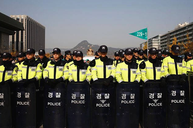 韩国警方在通往青瓦台总统府的广场前加强了警力,以阻止抗议者冲向总统府区域。(新华/路透)