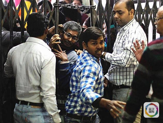 11月12日,印度安拉阿巴德市,焦急的民众冲入一家银行。(新华/美联)