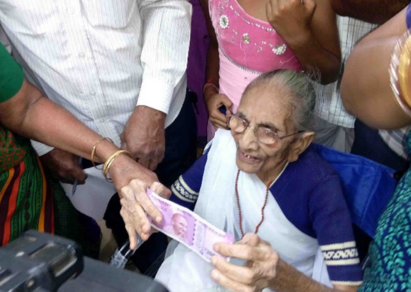 11月15日,印度总理莫迪的母亲向记者展示兑换的2000卢比面值的钞票。(图片来源:印度媒体)