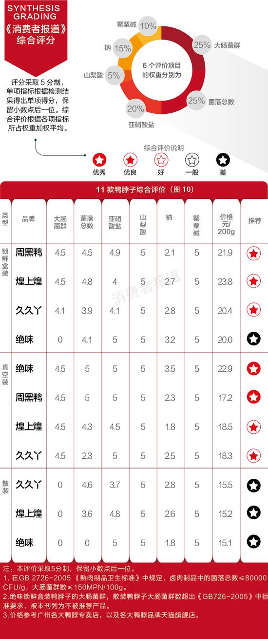好吃又安全,也需要精挑细选。2016年5月,《消费者报道》向第三方权威机构送检了周黑鸭、绝味、久久丫、煌上煌(35.310, -0.27, -0.76%)等4个主流品牌的11款鸭脖子,包括4款真空包装、4款锁鲜盒装、3款散装(周黑鸭无散装)。测试其安全性和营养性指标。